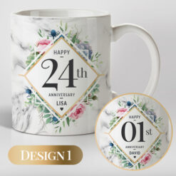 The Anniversary Hamper is made up with The hanging hearts Anniversary Frame. A stunning wooden frame with 2 hanging hearts on the side. The frame holds a 4inch x 6inch photo, that we can add for an additional €2.50. We have also added a set of personalised Anniversary Mug. A beautiful personalised candle with the anniversary type, year and couple’s names on it. Also included in this stunning hamper is the super cute anniversary teddy bear. Again, personalised with the anniversary type and date. To complete the hamper we have included a personalised Anniversary card.