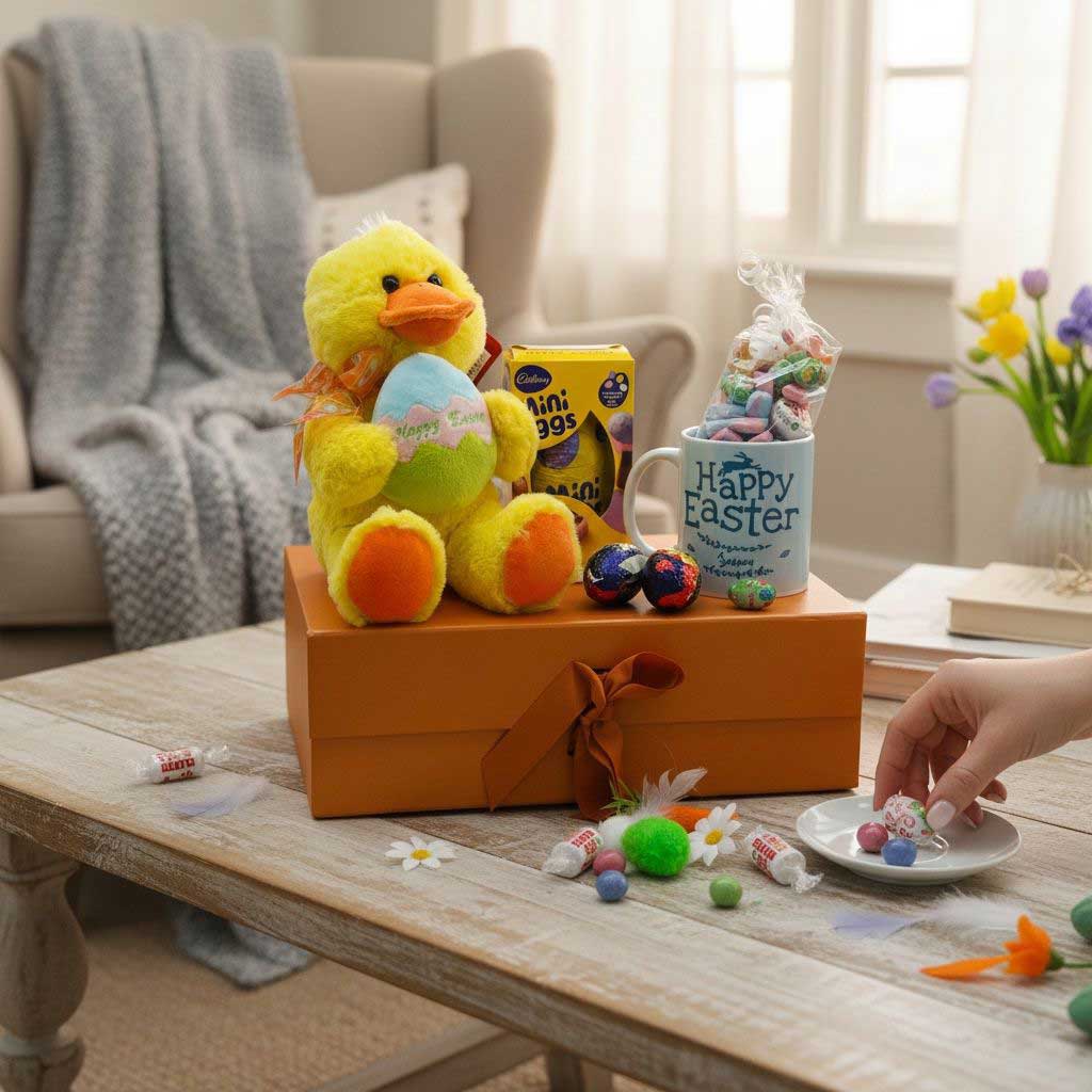 Featuring a cheerful Easter-themed mug filled with delicious sweets, along with a selection of popular Easter chocolates and a soft plush companion, this gift is ideal for all ages. Whether it’s for enjoying a warm cup of tea, coffee, or hot chocolate, the mug makes a lovely keepsake long after the treats are gone.