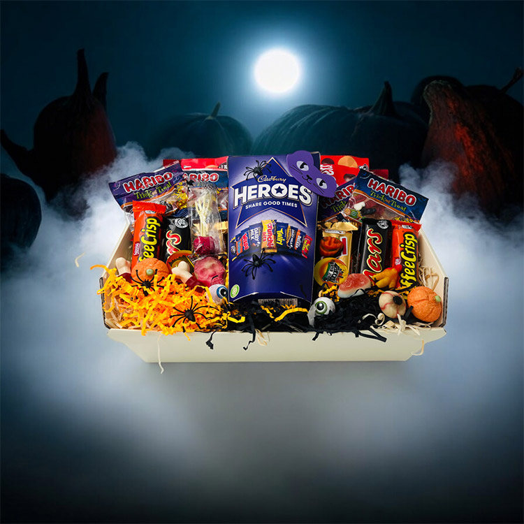 Spooky Sweet Treats Hamper – a yummy array of quality chocolate, Halloween sweets and decorations and jellys. This hampers comes beautifully presented in a basket and wrapped with a bow.