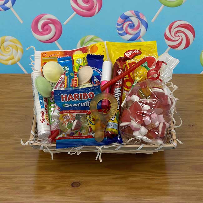 The Children’s Sweetie Basket – a yummy array of quality sweets for that special little person in your life. This comes beautifully presented in a basket and wrapped with a bow. Consists a mix of 20 plus sweets and a beautiful basket.