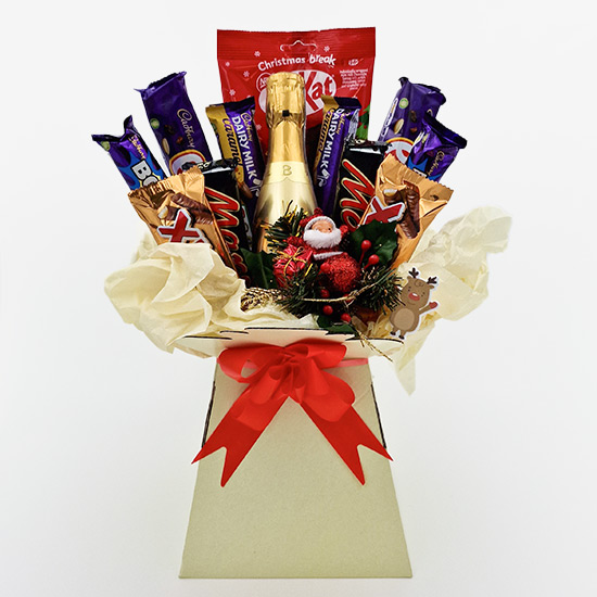 The Christmas Bottega Bouquet – Full size chocolate bars with a share bag, 2 artificial white flowers, and 20cl bottle of bottega thrown in for fun. These come beautifully presented and we gift wrap in cellophane and a bow. This is the ideal gift for a chocolatey lover!