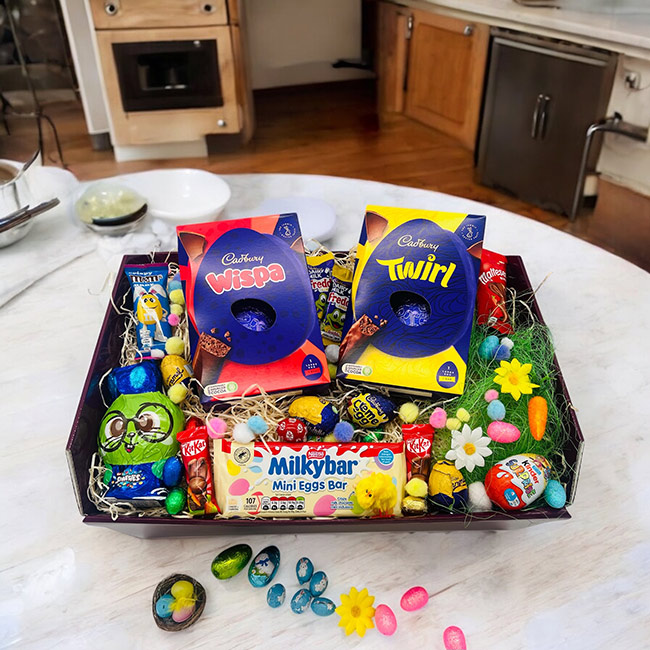 The Double Egg-cellent Hamper is a delightful Easter gift set priced at €53.95, featuring two large chocolate eggs and an assortment of Easter treats, all elegantly packaged in a large hamper. Please note that certain chocolate items may be substituted with similar products of equal size and value based on availability.