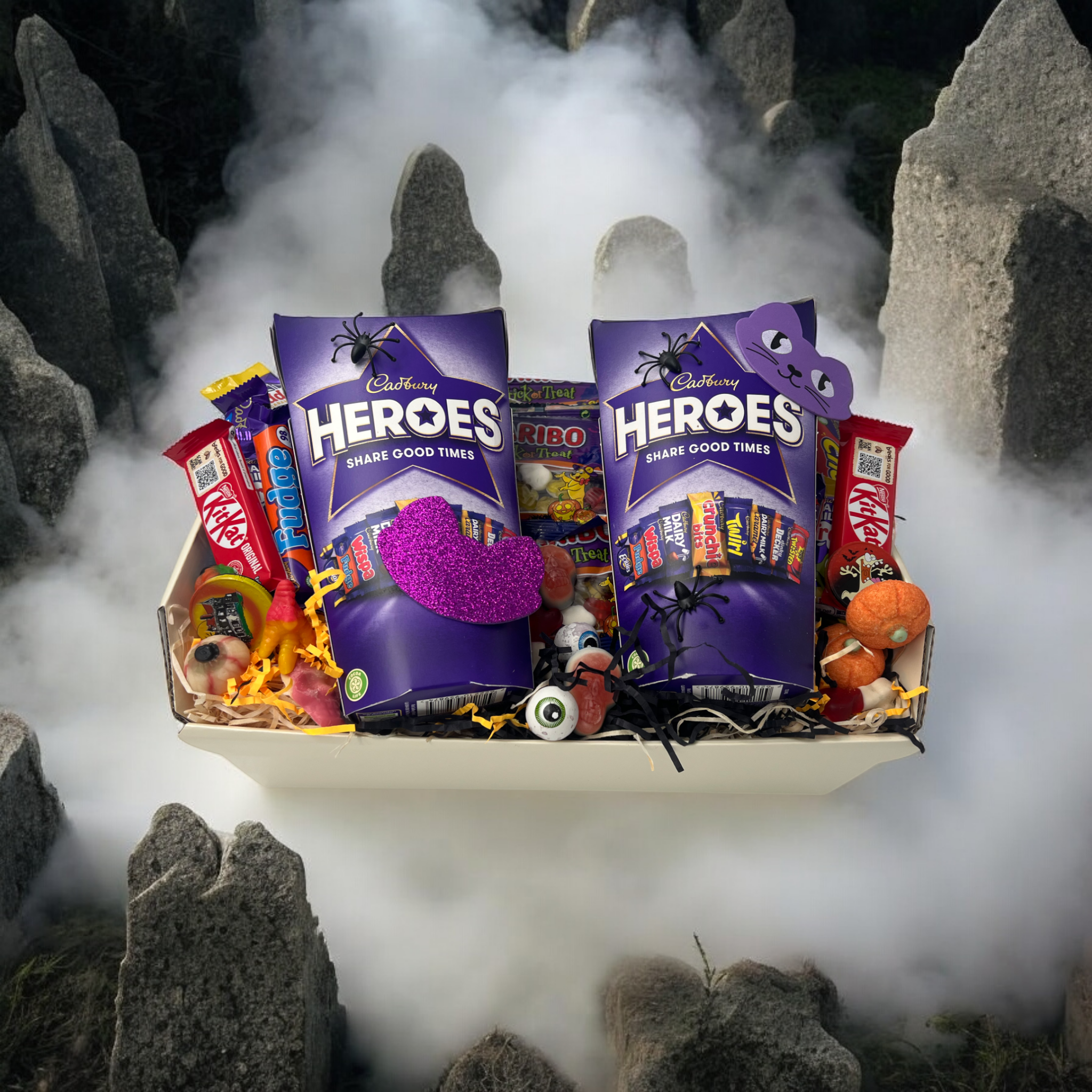 The Ultimate Sharing Spooky Hamper – a yummy array of quality chocolate, Halloween sweets and decorations and jellys. This hampers comes beautifully presented in a basket and wrapped with a bow.