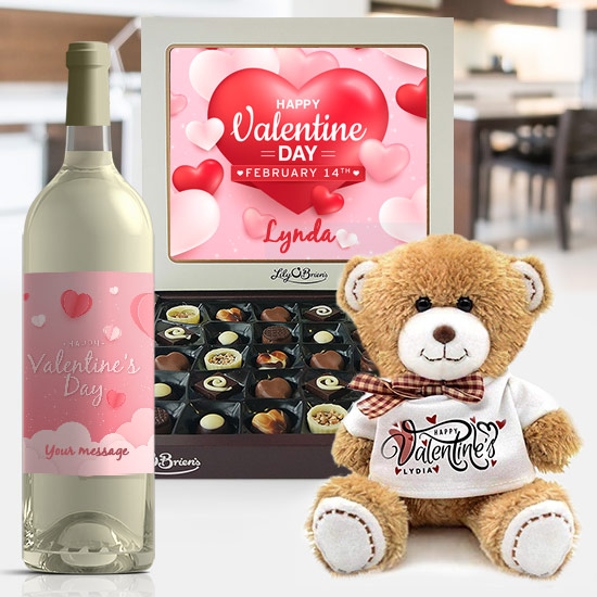 Valentines Day Gift Set includes 1 bottle of personalised wine. Personalise the label with their name and a message from you. You can choose from a bottle of deliciously approachable Merlot or Sauvignon Blanc. To order this product you must be 18 years and above. ID may be requested on delivery. The gift set also includes a personalised teddy and personalised chocolates.